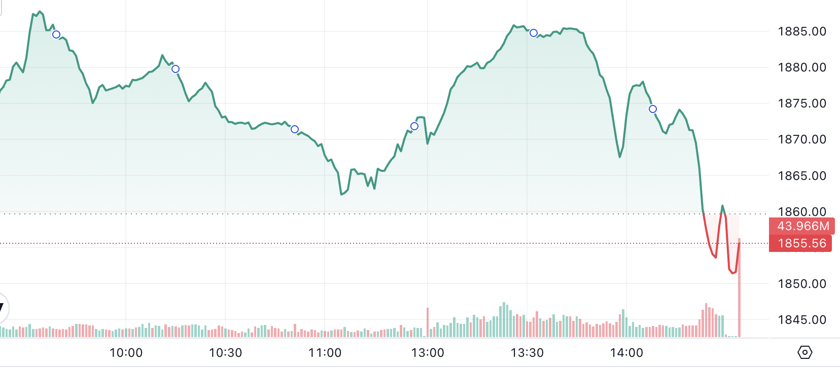 Trước đó, ngay từ đầu ngày, chỉ số tiếp nối đà tăng tích cực của phiên hôm qua và tăng mạnh. VN-Index tăng mạnh nhất lên 1.888,33 điểm trong phiên sáng, tương ứng tăng hơn 26 điểm. Độ cao của chỉ số giảm dần và ghi nhận sự giằng co sau đó, tiếp tục tạo sóng trong phiên chiều và bất ngờ đảo chiều giảm điểm vào cuối ngày. Tính ra, biên độ hôm nay là hơn 38 điểm.