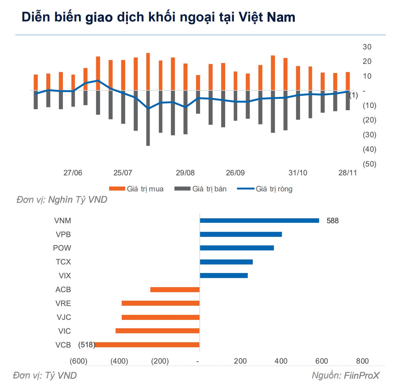 Trên thị trường Việt Nam, dòng vốn ngoại tiếp tục thu hẹp đà bán ròng trong tuần 24-28/11, còn -739 tỷ đồng, thấp hơn đáng kể so với tuần trước đó (-2,205 tỷ đồng). Bán ròng tập trung ở các cổ phiếu có quy mô lớn như VCB (-518 tỷ đồng), VIC (-413 tỷ đồng), VJC (-384 tỷ đồng). Ở chiều mua ròng, điểm sáng đến từ nhóm cổ phiếu đầu ngành gồm VNM (+588 tỷ đồng), VPB (+404 tỷ đồng), POW (+365 tỷ đồng).
