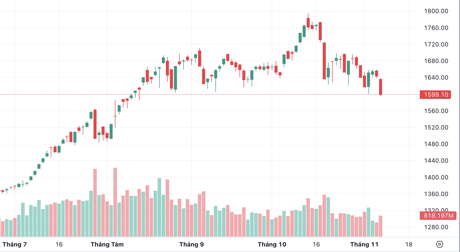 Chỉ số VN-Index phiên 7/11 giảm 44 điểm, kết phiên ở mốc 1.599,1 điểm (-2,7%). Áp lực bán diễn ra trong toàn bộ phiên giao dịch và dàn trải hầu hết các nhóm ngành trên thị trường. Thanh khoản trong phiên vẫn ở mức thấp so với giá trị trung bình 10 phiên gần nhất.